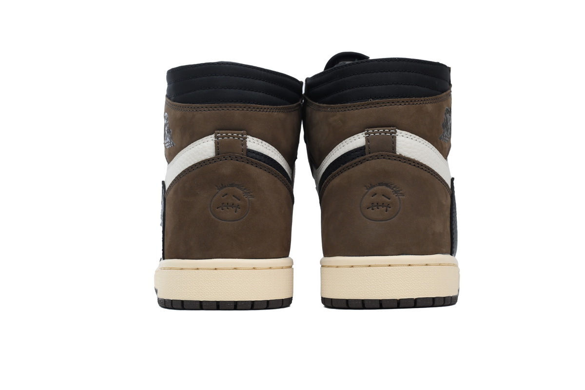 This high-top sneaker is a collaboration between Jordan Brand and Travis Scott, featuring a premium mix of sail leather and dark mocha suede overlays. Its most iconic detail is the reverse black Swoosh along the lateral side — an instantly recognizable Travis Scott signature.
