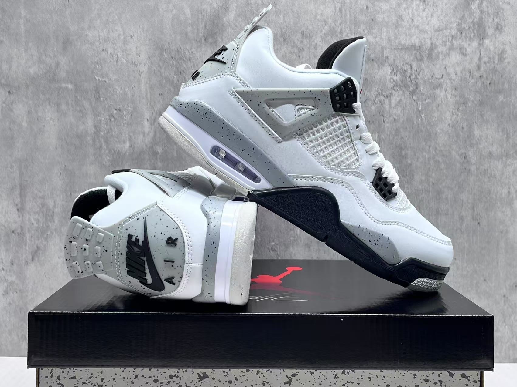 The Air Jordan 4 Retro “White Cement” showcases an iconic Tinker Hatfield design with a smooth white leather upper, reinforced with cement-grey wing panels featuring classic black speckle detailing. The heel includes the Nike Air logo for true heritage branding, a major highlight for collectors.