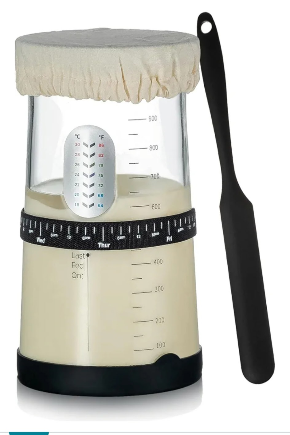 The clear glass jar allows you to monitor starter growth at a glance, while the built-in thermometer ensures ideal fermentation temperatures. The feeding tracker band helps you remember when you last fed your starter — no more guesswork!
