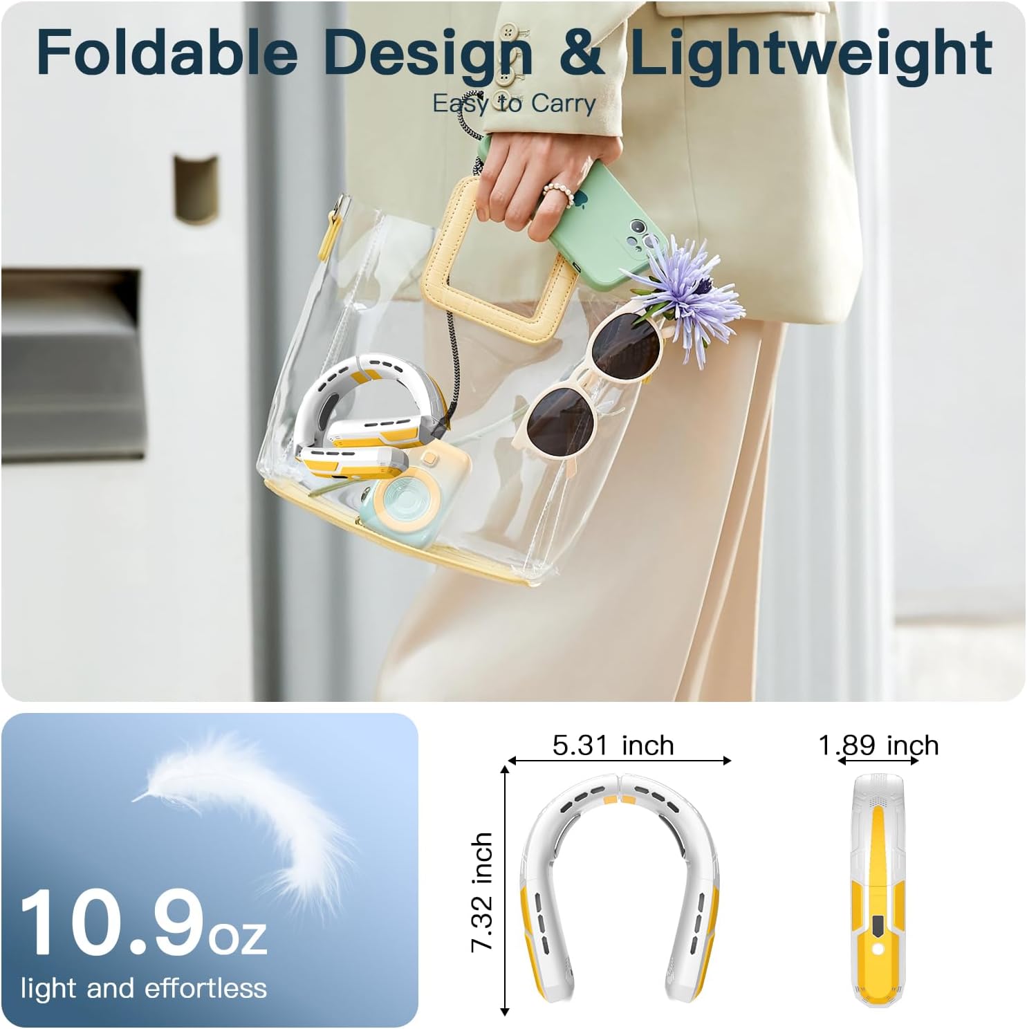 - 【Portable & Lightweight Our wearable neck fan features lightweight and foldable design, 7.3*5.3*1.8 inch, only 10 ounces weight, the small size design is convenient for you to carry while traveling. skin-friendly ABS material, putting less strain on the neck. The 80°~150° adjustable angle design fits different neck sizes. you can wear it for a long time comfortably to keeping you cool.
